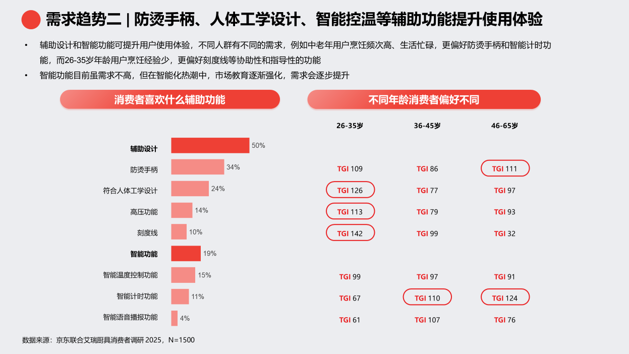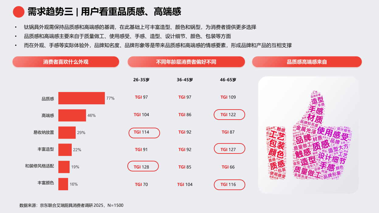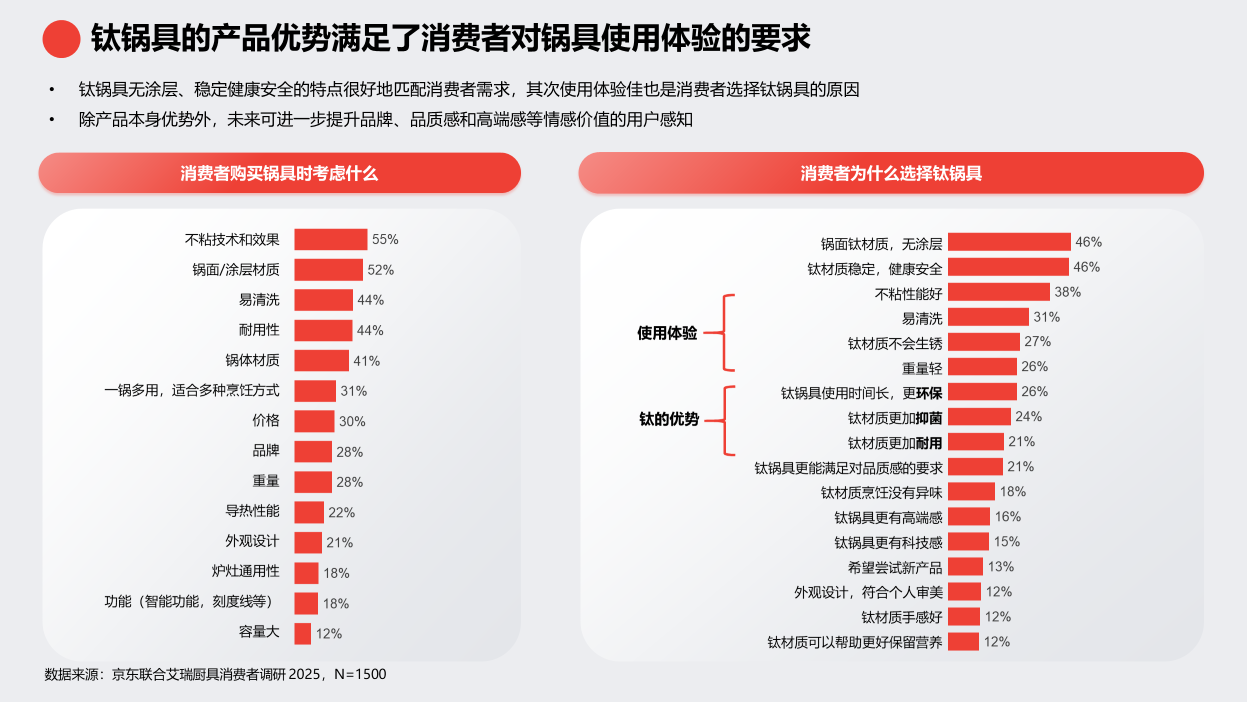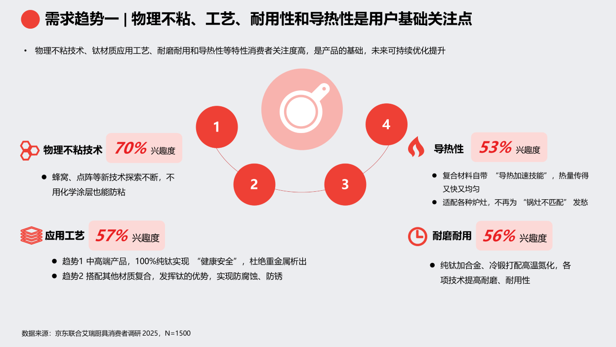 近日,京东零售家电家居事业群厨具业务部、京东新品创新中心、京东消费及产业发展研究院,携手艾瑞,及苏泊尔、爱仕达、飞剑、OOU等品牌方,共同发布《2025京东钛厨具趋势白皮书》,基于消费者调研和消费情况梳理,得到如下发现: