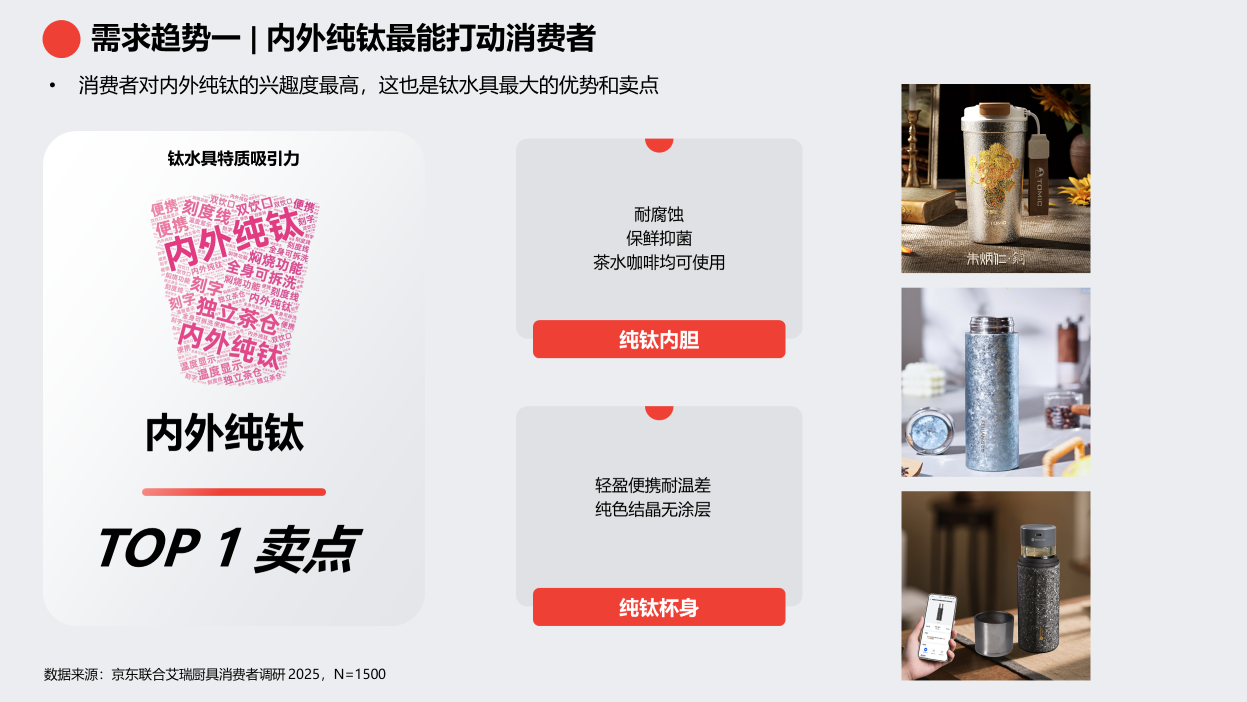 钛水具的外观也已极大丰富,例如色彩出现渐变、图案等,更具艺术性和美感;器型设计更加精致更加多元;而钛在不同温度下色彩多样,为定制和DIY提供了更多可能。这些都为钛水具带来了更多的品类特质和辨识度,也为消费者带来了更多的选择。而消费者喜欢的外观中,最重要的是便携设计,这和消费者选择钛水具最大的原因是“重量轻、便携”的优势是相呼应的。