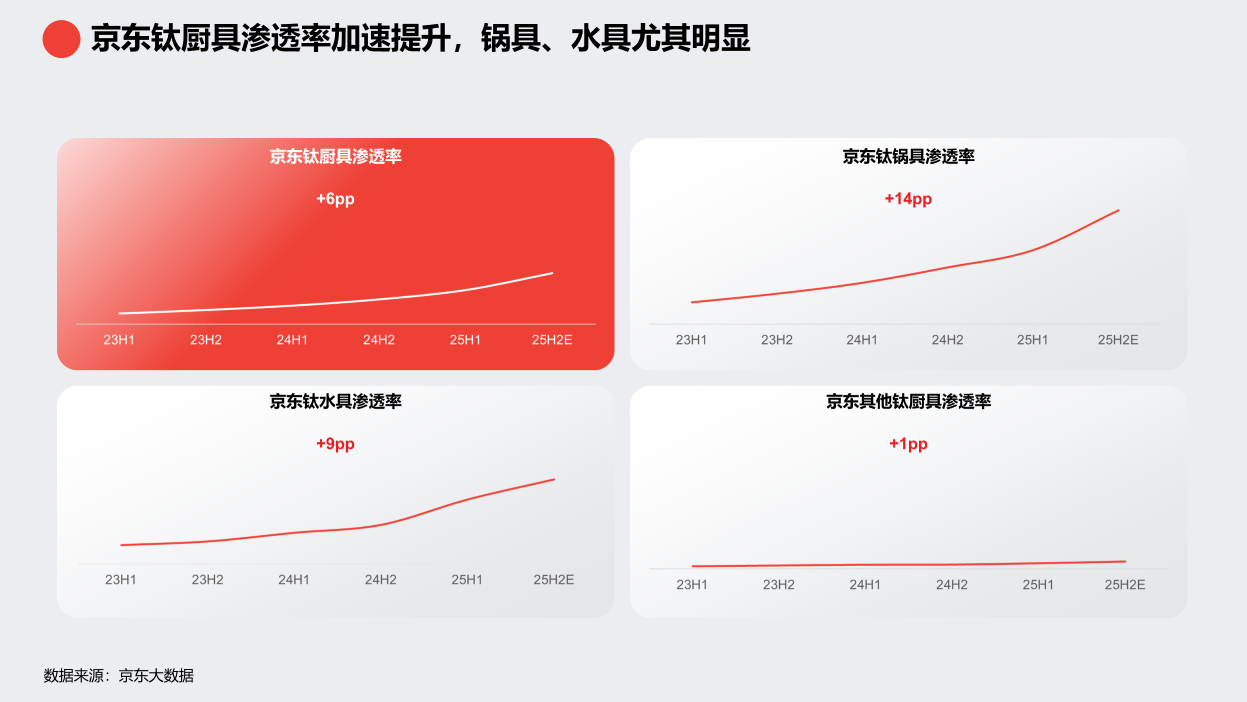 预测到25H2,京东钛厨具的渗透率相较23H1会增长6%,分品类来看,钛锅具的渗透率提升尤其迅速,消费者对烹饪过程中的安全更加重视。钛水具的渗透率增长略低于锅具,但随着产品更加丰富和外观多样化,钛水具的渗透率也会有更迅速的提升。其他钛厨具的渗透率,相对于锅具和水具,尚处于起步阶段,其优势与重要性将会逐渐被消费者重视。