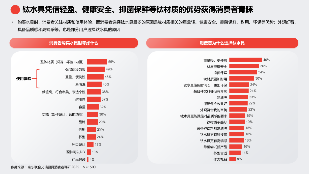 消费者挑选水具时,材质是最重要的,其次是保温保冷效果、重量、便携性、易清洗。消费者选择钛水具最大的原因是重量轻,其次是钛材质的健康安全、抑菌保鲜、耐用、环保、装多种饮料都无异味等优势。