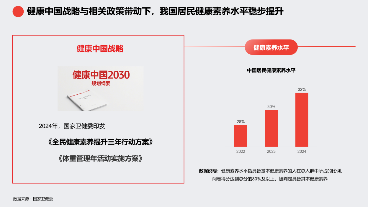 在目前的消费水平下,引导居民重视健康,养成健康的生活习惯是非常重要的。因此政策层面对于居民健康非常关注,2019年推出的《健康中国2030规划纲要》将国民健康提高到了国家战略层面。2024年国家卫健委相继发布了《全民健康素养提升三年行动方案》和《体重管理年活动实施方案》。在这样的政策影响下,居民的健康意识,系统性的健康知识不断提升,健康行业的发展升级也有了方向。