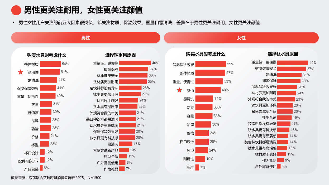 男性消费者和女性消费者在购买考虑以及选择钛水具的原因上有一些不同。在考虑因素的前五项中,虽然有四项相同,但男性更关注耐用,而女性更关注颜值。