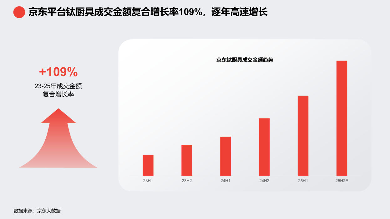 2023-2025年,京东平台钛厨具成交金额复合增长率高达109%,呈现出逐年高速增长的态势,下半年的成交金额还将继续攀升。整体增长趋势强劲,显示出钛厨具在京东平台有着广阔的市场前景和旺盛的消费需求。