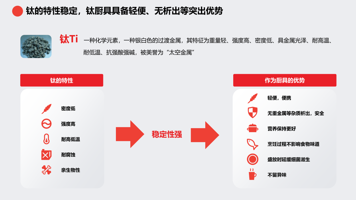 钛,化学性质稳定,耐高温、耐低温、抗强酸、抗强碱,同时强度高、密度低,被美誉为“太空金属”, 在非合金的状态下,钛的强度跟某些钢相若,但却还要轻45%。钛除了用于航天航空、船舶、化工、能源等方面,在日常生活中的应用也非常广泛,例如医疗、建筑、体育用品、消费电子等领域。世界上许多国家都已经认识到钛合金材料的重要性,相继对其进行研究开发,中国已成为全球最大的钛金属生产国和消费国之一。而钛的特性在做厨具时发挥出很大的优势,其稳定的特性带来很大的安全保障,无任何杂质析出,其密度低的特点使其重量轻,轻便便携。