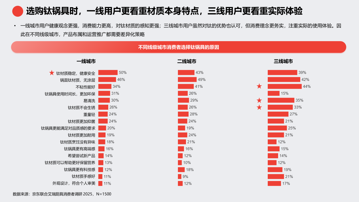 不同城市线级的消费者选择钛锅具的原因略有区别,一线城市消费者选择钛锅具最重要的原因是钛材质稳定,健康安全。可见一线城市消费者对钛的感知是最强的,更理解钛材质的优势。而三线城市消费者在钛材质以外,还很重视不粘性能、易清洗、不会生锈等使用体验,他们在挑选时更加务实。