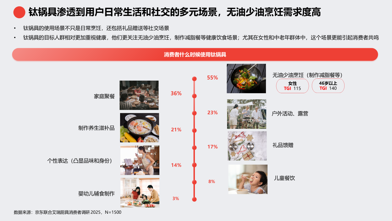钛锅具最初多在户外活动和露营中使用,而现在已渗透至日常餐饮、减脂饮食、制作养生补品等场景。其中无油少油烹饪(制作减脂餐)的场景,是高频使用场景,尤其是女性和46岁以上人群,有较高使用率。而钛锅具所具有的高端感和品质感,使它成为很多人礼品馈赠、凸显个人品味的选择。