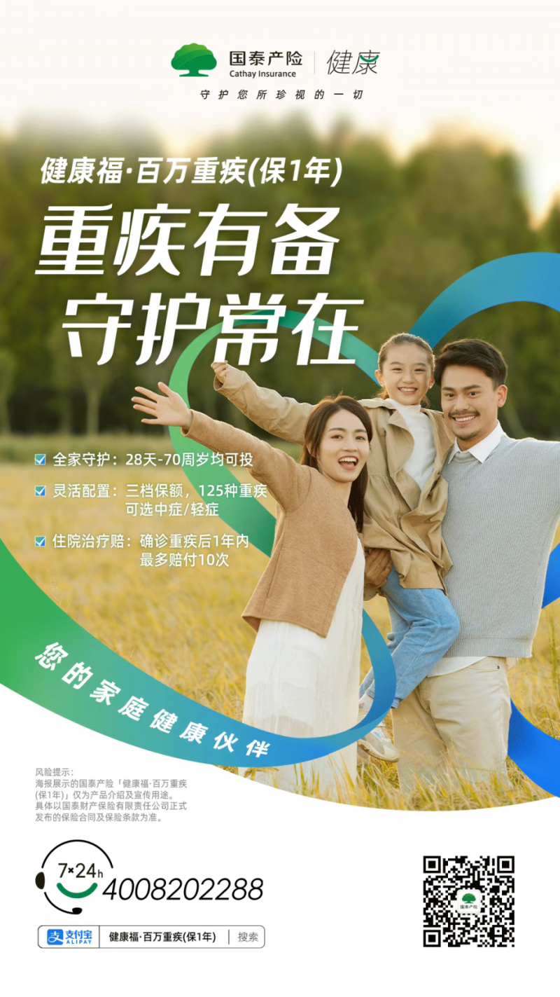 风险提示:本文所述国泰产险“健康福·百万重疾(保1年)”仅为产品介绍及宣传用途。具体以国泰财产保险有限责任公司正式发布的保险合同及保险条款为准。