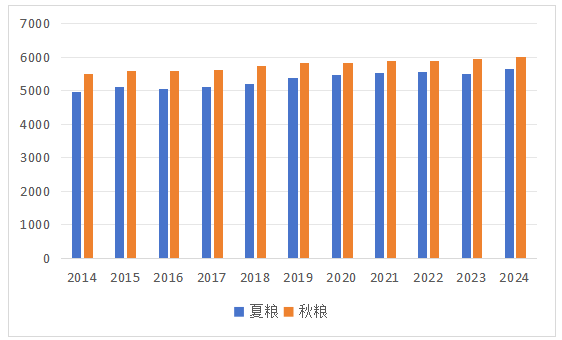 近年来,得益于农业机械化普及与智慧农业的发展,我国秋收粮食作物单位面积产量呈现逐年上升趋势。2024年全国秋粮播种面积87951.2千公顷,单位面积产量6008.3公斤/公顷,总产量52843.4万吨。