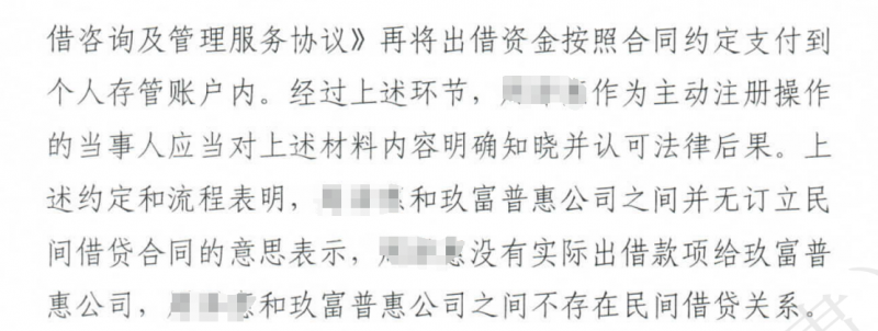 甘肃省高院经审查认为,本案的焦点问题是:出借人和玖富普惠公司之间是否存在民间借贷关系。该关系成立应以双方具有借贷合意且款项实际交付为要件,缺一不可。依据兰州中院原审查明的事实:出借人与玖富普惠签订《出借咨询及管理服务协议》,再将出借资金按照合同约定支付到个人存管账户内。出借人作为主动注册操作的当事人,应当对上述材料内容明确知晓并认可法律后果。裁定书中明确提到,出借人和玖富普惠公司之间并无订立民间借贷合同的意思表示,出借人没有实际出借款项给玖富普惠公司,出借人和玖富普惠公司之间不存在民间借贷关系。