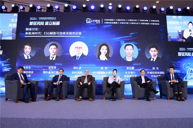 在《新航海时代:ESG 赋能可持续发展供应链》圆桌讨论环节,中诚信绿金副总裁张英杰与海尔鑫海汇数科总裁武铁铮、韵达股份董秘杨红波、中汽碳碳数字技术室主任赵津、东亚银行高级副总裁黄首鹏、中诚信绿金国际市场总监薛光展开讨论。嘉宾们聚焦出海、洞察行业机遇与挑战,建立链接、聚焦ESG 的赋能价值。