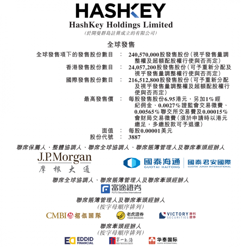 HashKey Holdings Limited(简称「HASHKEY HLDGS」),股票代码03887.HK)于2025年12月9日至12月12日招股,拟发行2.41亿股新股,招股价每股5.95-6.95港元,每手400股,入场费约2,808.04港元,集资额不超过16.72亿港元。HASHKEY HLDGS预计在12月17日于港交所挂牌上市。艾德金融担任本项目的联席牵头经办人。