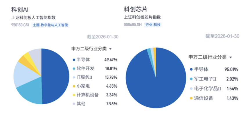 在科创板中,恰好有两只指数分别对应人工智能和芯片这两条赛道——上证科创板人工智能指数和上证科创板芯片指数。前者从科创板中选取30只业务涉及人工智能基础资源、技术及应用支持的上市公司,后者则覆盖半导体材料和设备、芯片设计、芯片制造、芯片封装和测试等芯片产业链各个环节的50家科创板公司。科创人工智能ETF易方达(588730)、科创芯片ETF易方达(589130)分别跟踪这两只指数,是布局相应领域的便捷工具。但对于普通投资者而言,应该如何选择?先把两只指数的具体特点看懂再说。