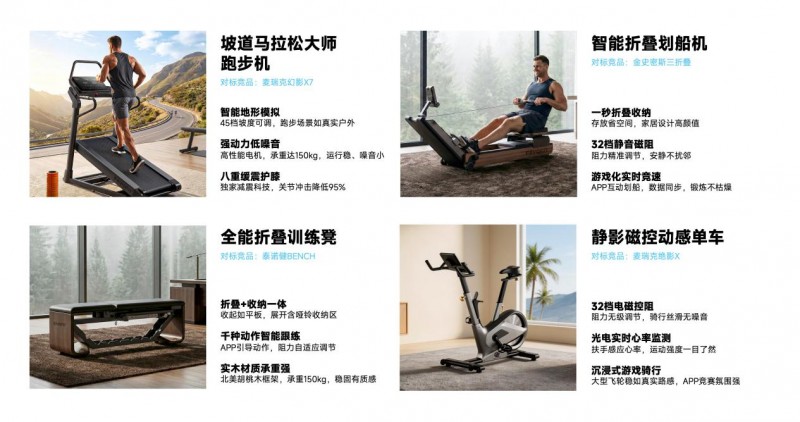 目前,旗下全能折叠训练凳、坡道马拉松大师跑步机、静影磁控动感单车、智能折叠划船机及健康配件已形成完整产品矩阵,品牌Dynamo Energy与FAVOFIT已推出50余款量产产品,预计至2026年将扩展至200余款SKU。通过自研高性能电机保障专业级动力输出,结合设计美学打破传统健身器械的冰冷感,再以AI算法实现动作纠偏与强度自适应,趣冲健身正以“科技为骨、用户需求为心”的理念重塑运动体验。