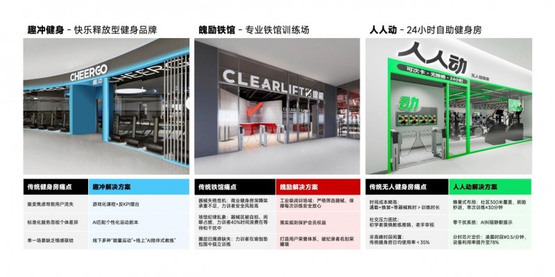 基于对用户群体的深度洞察,趣冲健身通过多品牌运作实现大众与细分市场的全面覆盖。旗下的人人动健身面向大众用户,以智能器械为载体,通过实时数据监测,打造“零门槛、无压力”的入门级健身方案,门店24小时营业,打破传统健身房的时段限制,让用户随时随地开启科学运动;魄励铁馆则为专业硬核用户打造,搭载AI动作监测系统的智能力量设备,满足资深用户对力量与数据追踪的双重需求;趣冲团课面向社交体验型用户,通过沉浸式灯光音响与互动课程设计,将运动空间转化为社群连接场域。