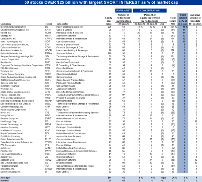 高盛名单上的其余被做空最严重个股,包括了Strategy、CoreWeave、Coinbase、LiveNation、Robinhood和Apollo等。