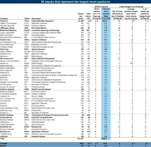 从高盛的报告来看,特斯拉再度“荣登”美股做空最多个股的榜首,“新晋”上榜的摩根大通则颇为出人意外地出现在第四位。值得一提的是,在高盛重仓做空股票篮子中的许多其他新成员——在下表中以黑色粗体显示——可以被公允地归类为较弱的AI参与者或泡沫异常严重的AI相关股票。