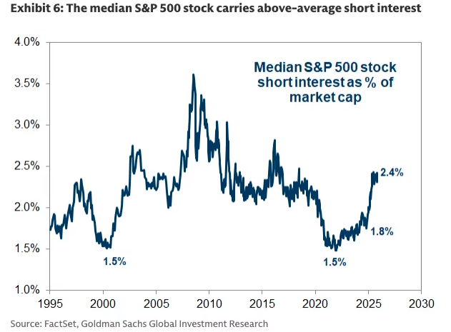 先来看整体市场的情况。尽管年内经历了强劲的涨势,但标普500指数成分股的空头比例中位数仍然高得惊人。目前的空头头寸相当于总市值的2.4%,处于过去五年的第99百分位——且远高于自1995年以来的长期平均水平。