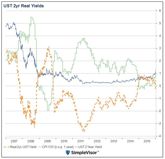 在金融危机期间,美联储史无前例地将利率降至零、推出量化宽松政策(QE)并实施了一系列货币救助。由此导致实际利率(经通胀调整后)跌入负值区间。下图就显示了,2年期美国国债实际收益率如今在2009年的急剧下挫,并持续走低至2011年中期……