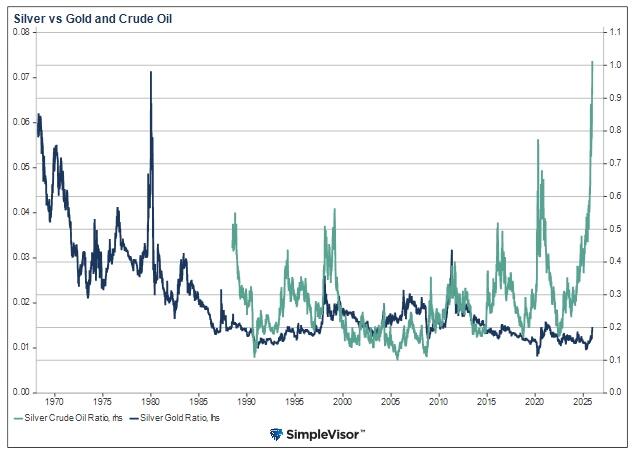 目前来看,白银与原油比值(绿线)已攀升至至少1990年以来的历史高位。图表显示过去曾多次出现此类飙升。而若本次同样属于短期冲高,则意味着原油价格即将大幅上涨,或白银即将迎来剧烈回调。