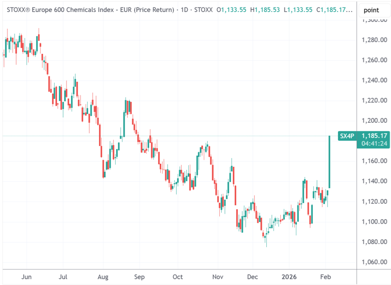 在刚刚结束的欧盘交易时段,近年来命运多舛的欧洲化工板块迎来近4年最大单日涨幅。影响全球股市的“板块轮动”浪潮,以及有关欧盟放宽碳排放政策的传闻,共同构成大涨背后的推手。