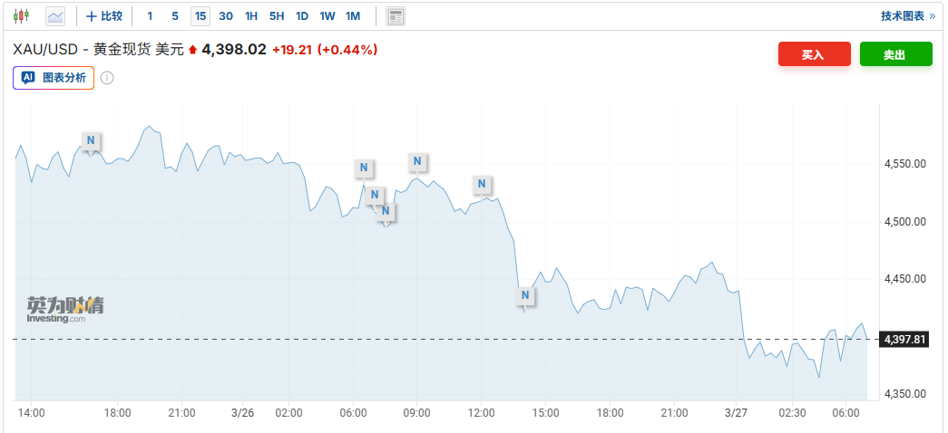 智通财经获悉,由于美国总统特朗普就美国与伊朗是否能够达成协议以结束这场持续近一个月战争释放出相互矛盾的信号,全球市场进一步动荡,黄金价格随之下跌。周四,黄金价格一度下跌最多3.4%、接近技术性熊市——通常定义为较近期高点下跌20%,但在特朗普表示将延长暂停打击伊朗能源设施的期限后收窄部分跌幅。特朗普在社交平台上发文称,“谈判仍在进行中”,“尽管所谓的‘假新闻媒体’及其他人的错误说法相反,谈判进展非常顺利”。截至发稿,黄金现货涨0.44%,接近4400美元/盎司。