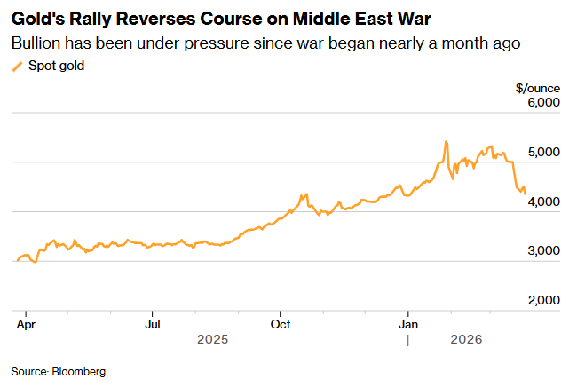 自近一个月前中东战争爆发以来,金价已下跌逾15%,其走势基本与股市同步,而与油价呈反向关系。能源价格飙升加剧了通胀风险,并导致投资者押注各大央行将维持利率不变或加息。这对无收益的黄金来说是一个不利因素。
