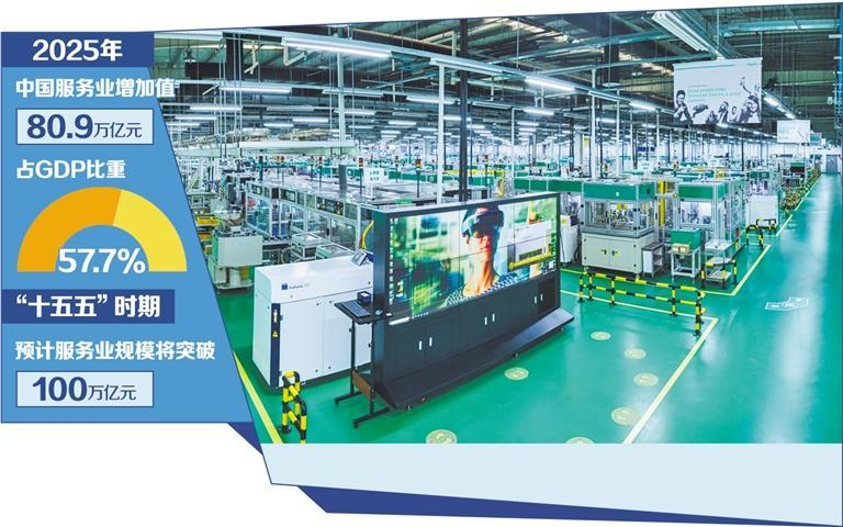 近年来,中国服务业实现跨越式发展。2025年,中国服务业增加值达到80.9万亿元,占国内生产总值(GDP)比重达57.7%,对经济增长的贡献率为61.4%。“十五五”时期,预计服务业规模将突破100万亿元。