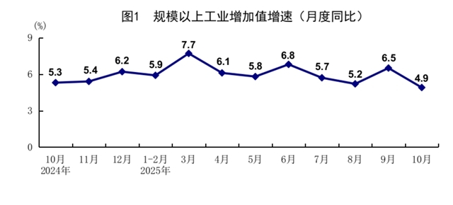 10月份,全国规模以上工业增加值同比增长4.9%,环比增长0.17%。分三大门类看,采矿业增加值同比增长4.5%,制造业增长4.9%,电力、热力、燃气及水生产和供应业增长5.4%。装备制造业增加值同比增长8.0%,高技术制造业增加值增长7.2%,分别快于全部规模以上工业增加值3.1和2.3个百分点。分经济类型看,国有控股企业增加值同比增长6.7%;股份制企业增长5.2%,外商及港澳台投资企业增长4.0%;私营企业增长2.1%。分产品看,3D打印设备、新能源汽车、工业机器人产品产量同比分别增长30.8%、19.3%、17.9%。1—10月份,全国规模以上工业增加值同比增长6.1%。10月份,制造业采购经理指数为49.0%,企业生产经营活动预期指数为52.8%。1—9月份,全国规模以上工业企业实现利润总额53732亿元,同比增长3.2%。