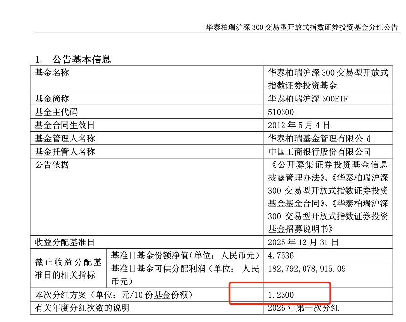 1月11日晚间,沪深300ETF华泰柏瑞公告了2026年现金分红情况,分红方案为每10份基金份额分红1.23元,权益登记日为1月16日,现金红利发放日为1月27日。这也是该ETF每10份基金分红首次突破1元。