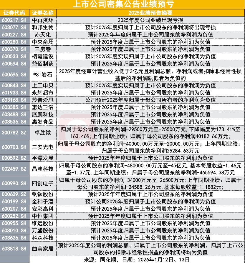 此外,包括平潭发展、和邦生物、赤天化、中再资环、中央商场、益佰制药、*ST岩石、上工申贝、永辉超市、莎普爱思、惠达卫浴、展鹏科技、惠发食品、钒钛股份、金种子酒、安彩高科、中恒集团、维远股份、万盛股份、科森科技以及曲美家居等公司公告2025年度公司业绩出现亏损。