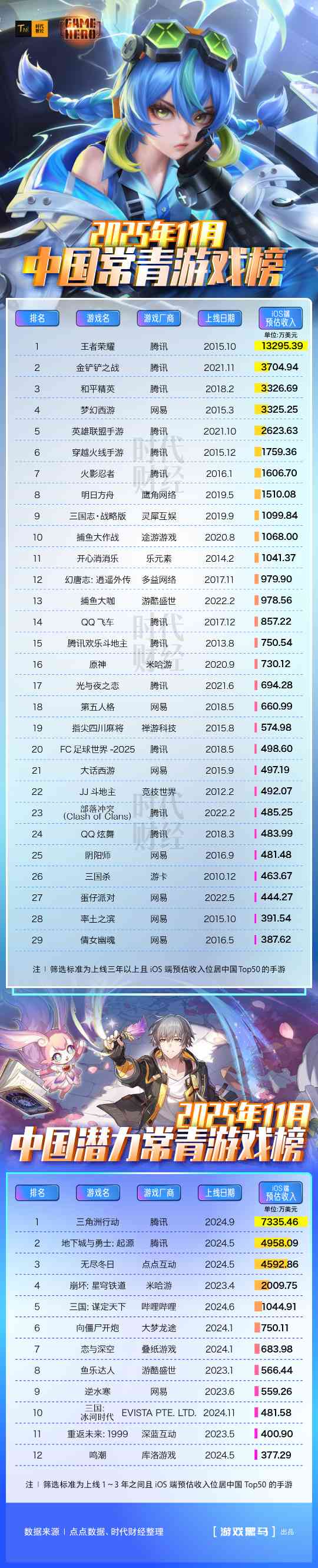 时代财经以上线3年以上且iOS端预估收入跻身中国地区Top50为筛选标准,统计并发布《2025年11月中国常青游戏榜》(下称“《常青榜》”);同时以上线1年至3年且iOS端预估收入跻身中国地区Top50为标准,统计并发布《2025年11月中国潜力常青游戏榜》(下称“《潜力常青榜》”)。