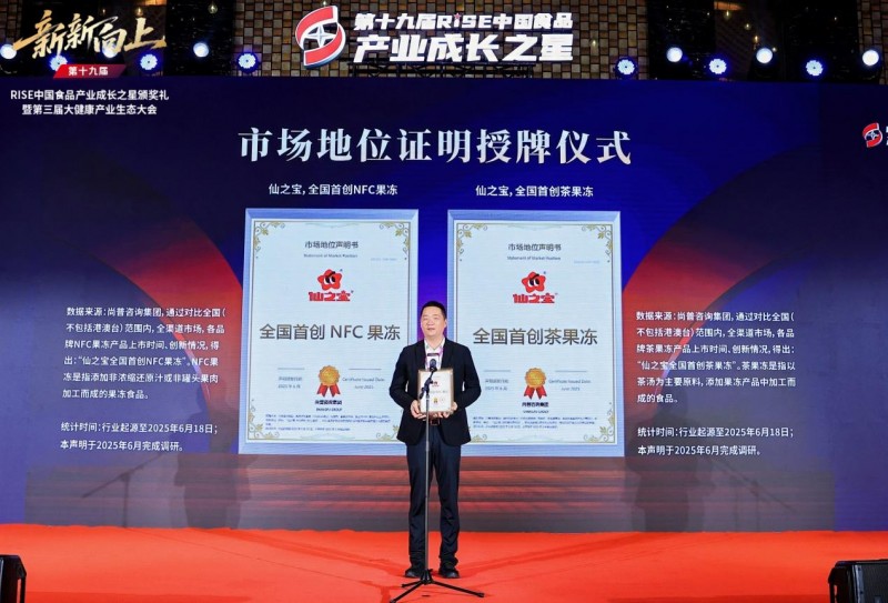 在盛典现场,还举行了隆重的市场地位证明授牌仪式。基于充分的市场数据调研与验证,仙之宝被正式授予“NFC果冻全国首创,全国销量第一”与“茶果冻全国首创,全国销量第一”两项权威认证。这不仅是对我们产品创新能力的最高肯定,更是对我们市场占有率与消费者认可度的有力证明,标志着仙之宝已牢牢占据这两个新兴细分品类的绝对领导地位。