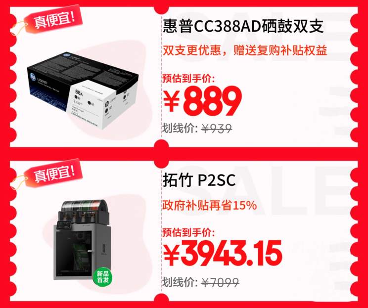针对持续输出的打印需求,耗材选择同样关键。惠普CC388AD原装双支黑色硒鼓适配多款主流打印机,双支装更优惠且赠送复购补贴权益,京东11.11到手价889元,可满足长期打印需求,减少频繁更换的麻烦。热爱创意设计的用户,拓竹P2SC 3D打印机可享政府补贴省15%,到手3943元起,大尺寸FDM打印、高精度高速与AI监测烘干功能,为桌面立体创作提供专业工具。