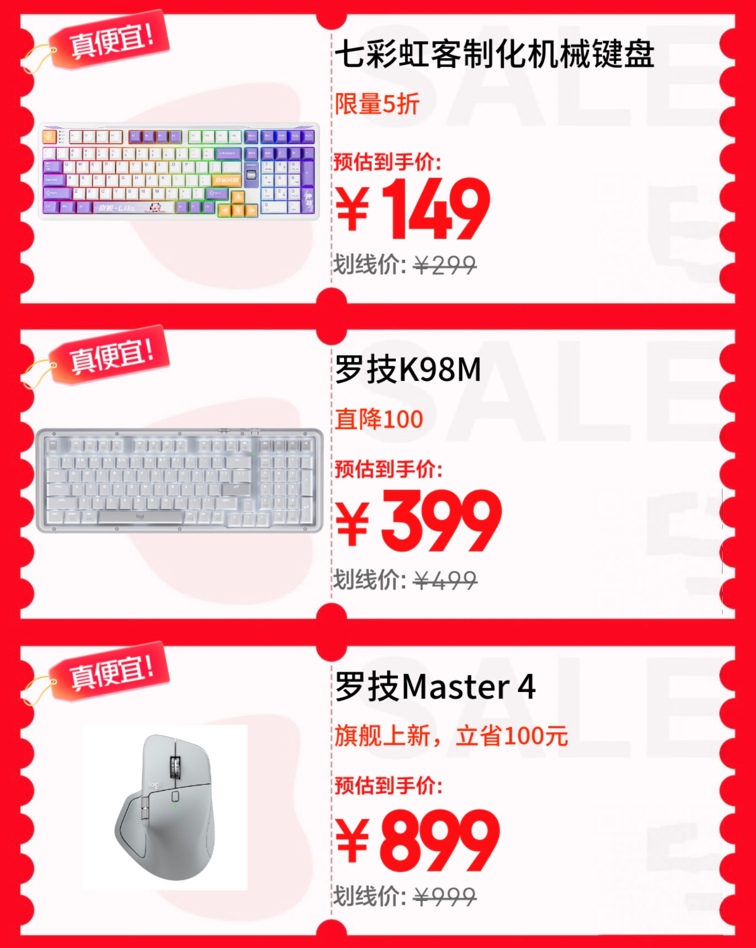 对于专注案头工作的用户而言,键盘、鼠标等基础外设升级正当时。若偏爱个性化与手感,七彩虹青羽98三模机械键盘日常价299元,限量5折后仅需149元,霜华配色搭配星霜凝轴,兼顾办公与轻度游戏的舒适输入;罗技ALTO KEYS K98M琥珀系列无线键盘直降百元,优惠到手价399元,大理石轴与热插拔设计适配多元需求。罗技大师系列MX Master 4高性能无线蓝牙鼠标旗舰上新,立省100元后到手899元,静音设计与无线接收器配置,为高频办公提供更流畅的操控体验。