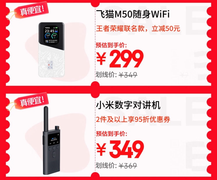 移动办公与团队协作场景下,设备选择更需兼顾便捷与稳定。飞猫M50王者荣耀联名款5G随身WiFi作为2025旗舰新款,立减50元后249元到手,支持三网免插卡与通用流量,外出差旅或临时办公的网络需求轻松解决。小米数字对讲机则以轻薄机身与大功率远距通话能力,成为团队户外作业或跨区域沟通的实用工具,2件及以上还能享95折优惠。