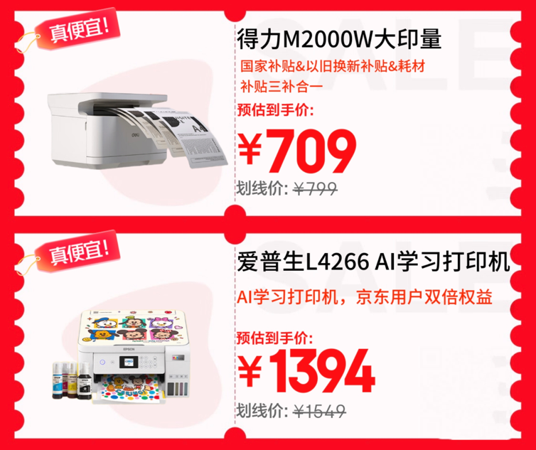 打印场景中,得力M2000W三合一激光打印机叠加国家补贴、以旧换新等多重优惠,到手709元,4500页长效印量与手机无线连接功能,轻松应对家庭作业打印与办公文件处理。爱普生L4266 AI学习打印机,京东11.11到手1394元,支持自动双面与AI学习打印功能,让办公输出更省心。