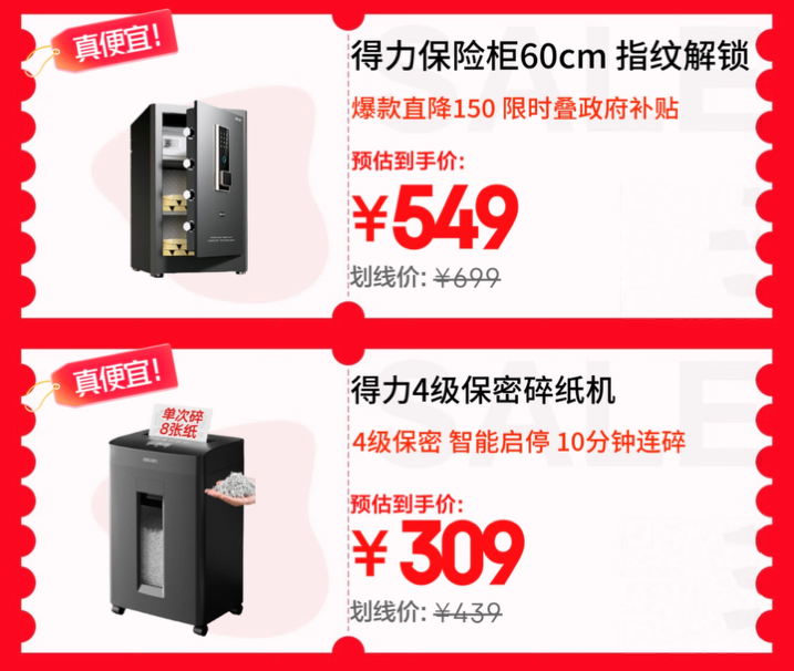 文件管理方面,得力AE66-ZM保险柜爆款直降150元,京东11.11叠加政府补贴后549元即可入手,指纹密码等4种解锁方式与可入墙设计,为重要资料提供安心守护;得力GA311碎纸机京东11.11优惠价309元,带来4级保密、单次8张碎纸与智能启停功能,敏感文件处理更放心。