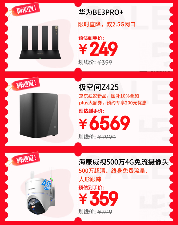 若需搭建家庭或小型团队的智能中枢,极空间Z425私有云旗舰版值得关注,作为14核14线程四盘位NAS,搭载万兆网口与专属UPS,京东下单可叠加国补10%优惠与PLUS会员大额券,预约专享200元优惠后到手6569元,为多设备文件存储与AI协作提供可靠支持。华为路由BE3 Pro+则以WiFi7+双2.5G网口与智能天线设计,限时直降后249元即可升级家庭网络。海康威视Q3P5M 4G摄像头凭借终身免流量、500万像素与360度全景监控功能,成为安全防护的优选,京东11.11优惠到手价359元。