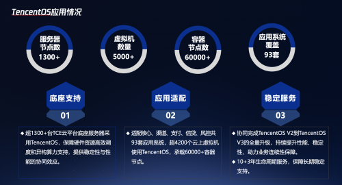 四川银行新一代工程云平台底座1300+物理服务器云底座上全部采用腾讯操作系统TencentOS,深度适配核心、渠道、支付、信贷、风控共93套应用系统,超过5000个云上虚拟机部署使用TencentOS,承载了60000+容器,助力四川银行实现了从底层芯片到上层应用系统的全链条自主可控,充分保障了供应链安全。