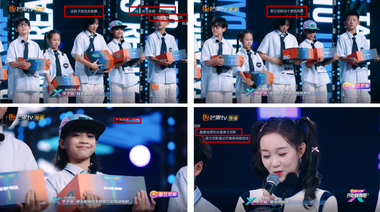随后的节目中,泰兰尼斯不断创新植入方式:针对选手“鞋总打滑”痛点递上稳跑鞋作为“秘密武器”;借学姐回归助阵送上“稳跑心意”;通过集体穿着展示塑造品牌为舞者社群“标配”装备;作为游学晋级礼品与“荣誉”、“新征程”等正向价值深度绑定。
