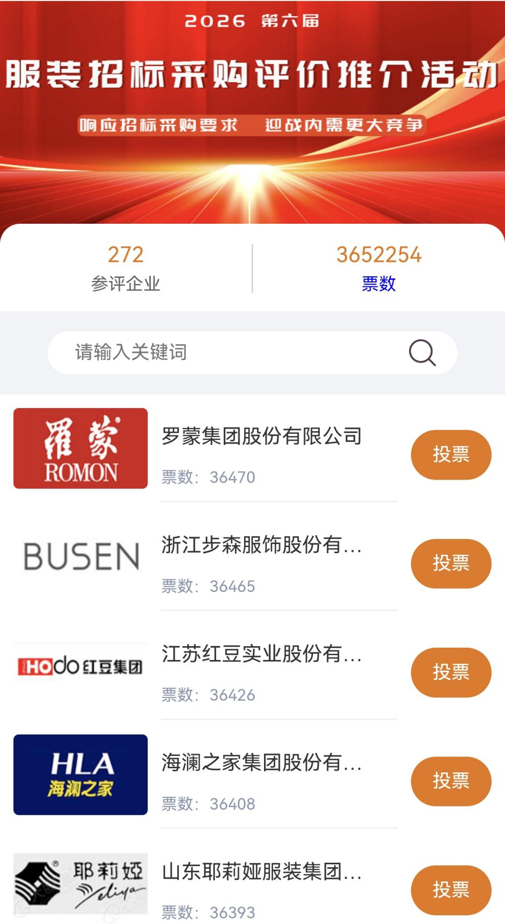 为助力优秀诚信的服装供应商进一步提升品牌价值和强化品牌优势,在招标采购市场中获得更多的份额,中国采购与招标网、中国名企排行网联合主办了以“响应招标采购要求、迎战更大内需竞争”为主题的“2026(第6届)服装招标采购评价推介活动”。活动现已进入白热化的网上展示和投票阶段。主办单位现发布活动第二期情况通报。