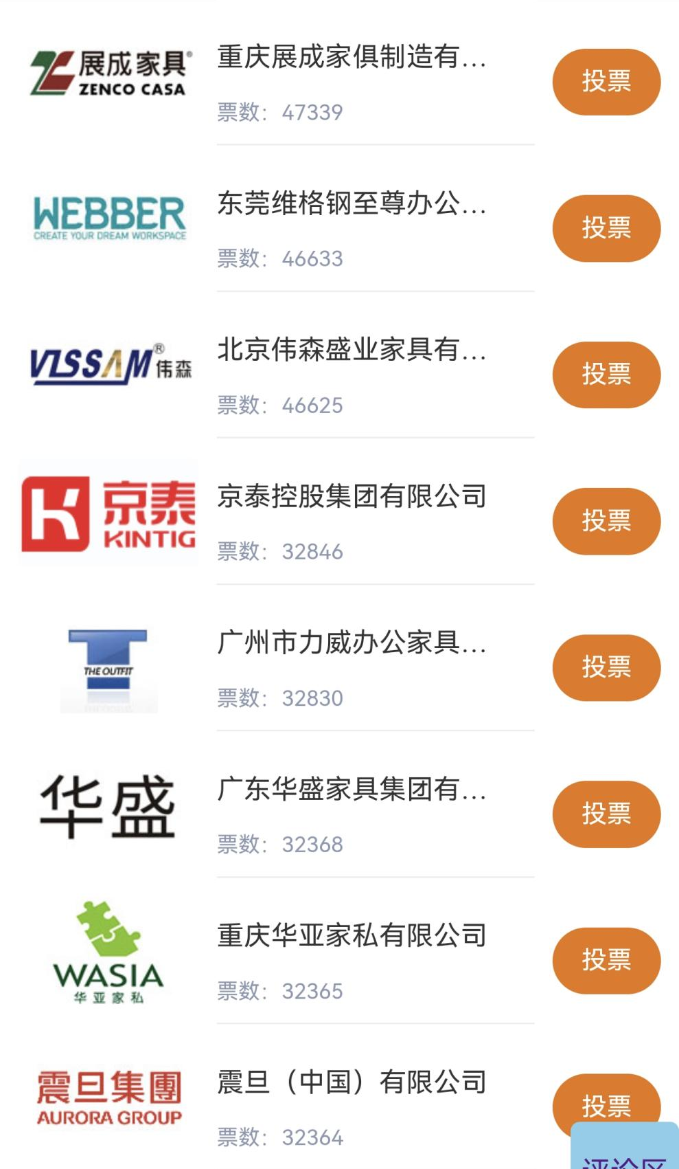 截至1月16日下午1:15分,网上共展示405家参评企业,总票数5585431票,得票前10名如下: