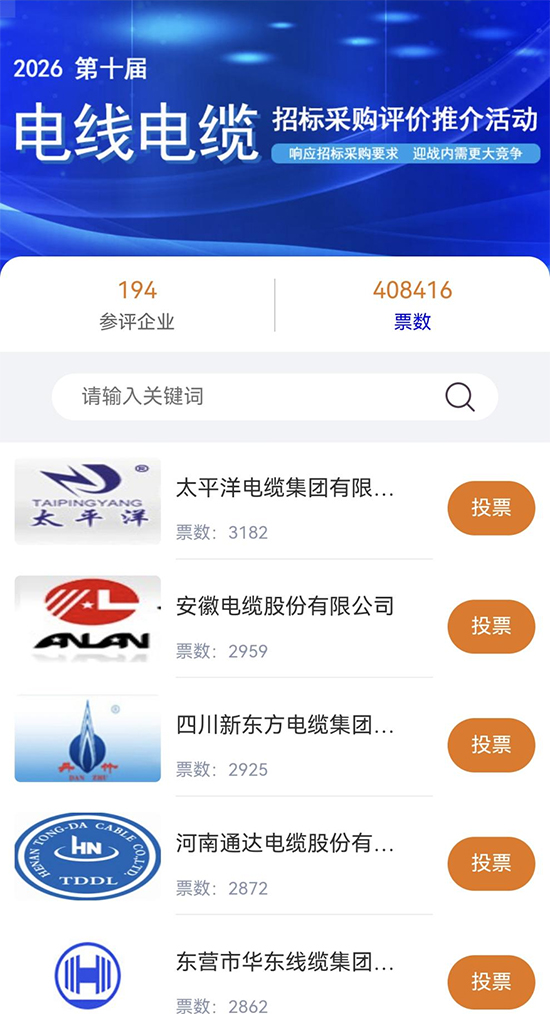 为助力优秀诚信的电线电缆供应商提升品牌价值和强化品牌优势,在招标采购市场中获得更多的份额,中国采购与招标网、中国名企排行网特联合主办了以“响应招标采购要求、迎战更大内需竞争”为主题的“2026(第10届)电线电缆招标采购评价推介活动”。活动现已进入网上展示和投票阶段。主办单位现发布活动第一期通报。