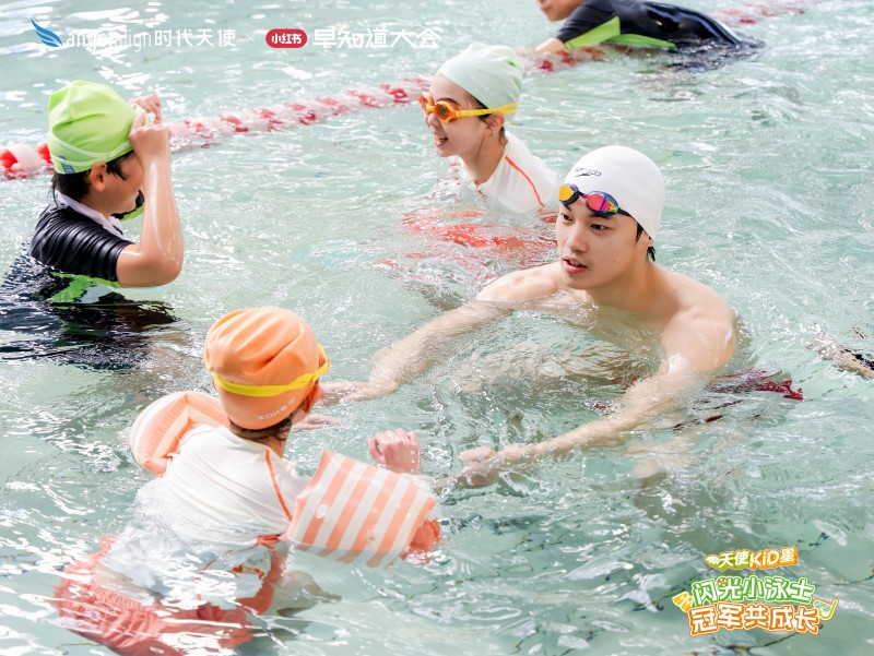 在之后的游泳教学环节,汪顺带领孩子们完成基础训练与互动,更亲自带小朋友下水感受游泳的魅力,教授憋气、划水等技巧,在运动中传递自信、专注与坚持的价值。最后,汪顺与时代天使共同为“天使KiD星”小朋友颁发专属勋章,完成荣耀加冕并与孩子们合影留念。