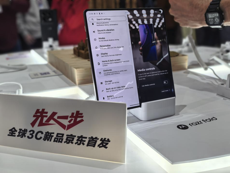 在联想展区,京东采销则重点体验了联想moto razr fold新品。作为联想moto首款大折叠手机,这款手机搭载骁龙8 Gen5移动平台、6000mAh大电池及三摄5000万像素影像系统,以及天禧AI智能体,将于近期在中国市场推出。