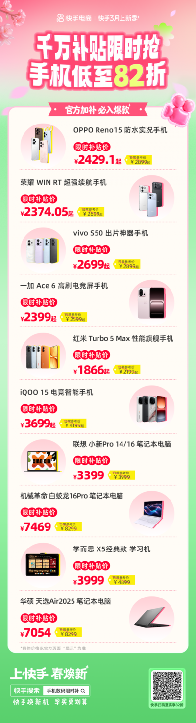 近期,由于存储芯片成本持续攀升,“手机行业将迎5年来最大涨价潮”等话题持续升温,引发市场关注。3月3日,快手3月上新季加码千万补贴,联动多家手机数码品牌推出专属购机福利,限时购机至高可享82折,为用户提前锁定涨价潮前消费窗口期。