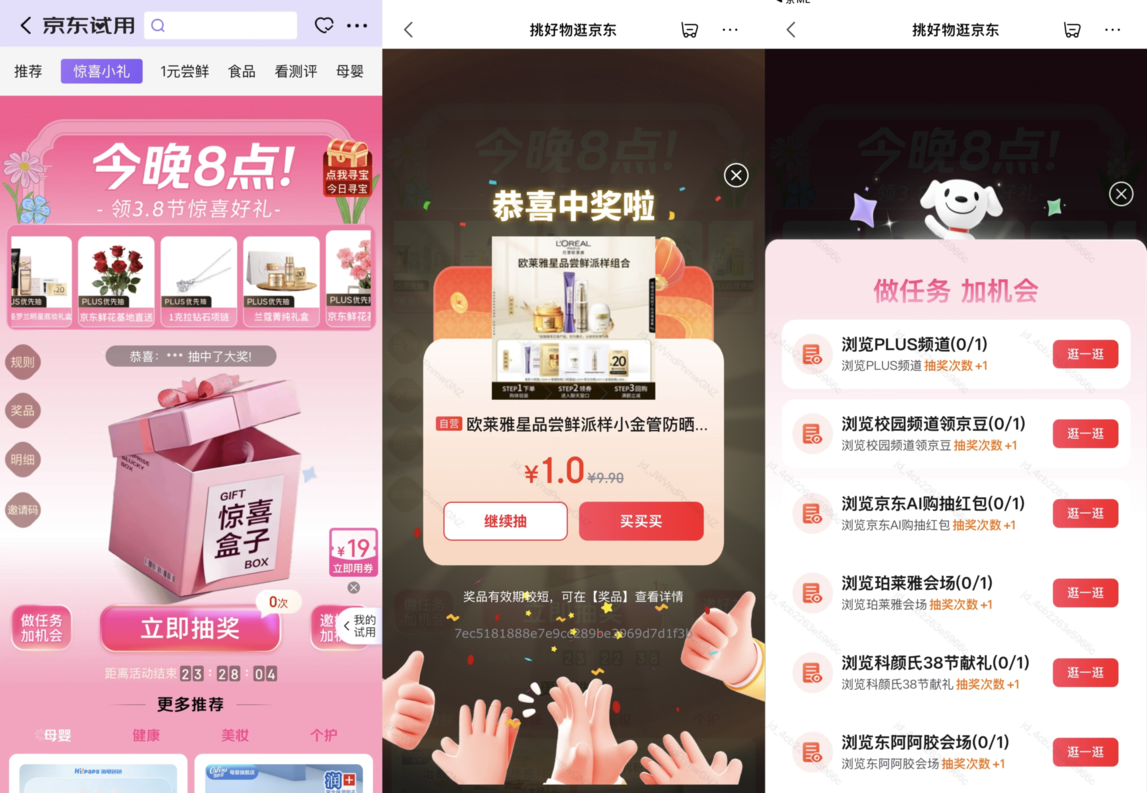 京东3.8节推出多重节日福利:百万份试用礼免费送,下单送礼有机会获赠五色花