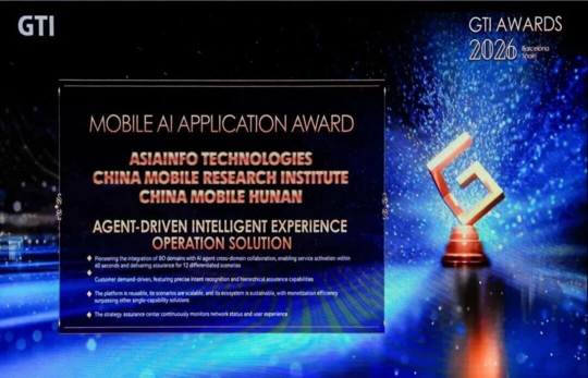 3月3日,MWC26·Barcelona(2026世界移动通信大会·巴塞罗那)期间,全球通信行业重磅奖项GTI Awards正式揭晓。亚信科技携手中国移动研究院、湖南移动打造的“智能体驱动的体验保障管理解决方案”凭借领先的技术创新与落地实践斩获“最佳移动AI应用奖”(Mobile AI Application Award)。这标志着亚信科技与中国移动在AI技术创新和服务变现等方面的探索获得了全球通信行业的高度认可。