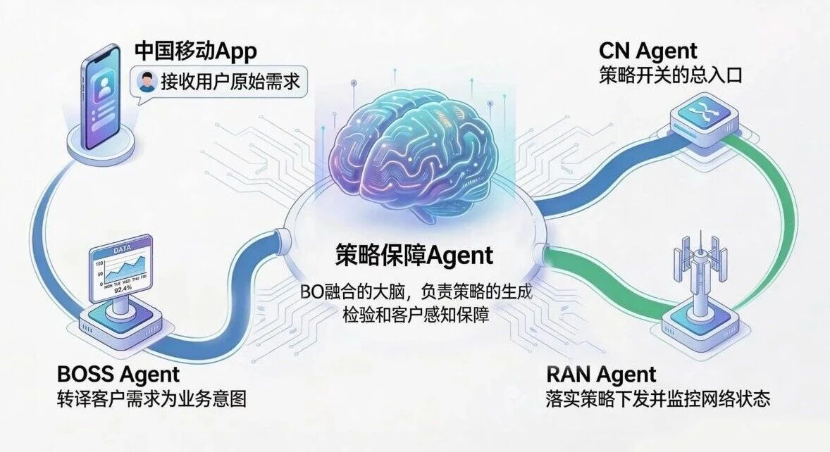 方案依托多智能体协同机制,可精准解析用户订阅业务意图并生成网络优化及保障策略,通过高效编排O域既有能力,实现业务意图的精准感知与保障策略的主动落地,并对开通业务的客户持续跟踪,在保障客户体验的同时实现网络负荷的动态平衡,为5G网络从“规模建设”向“价值运营”转型提供了全新实践路径。