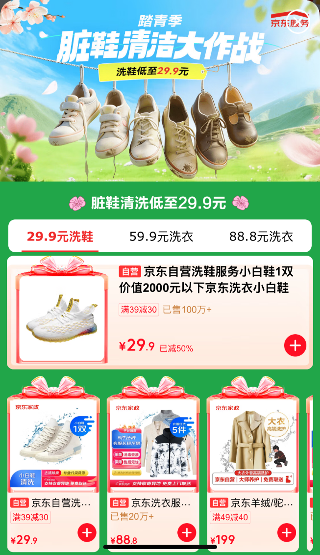 京东服务现已覆盖家政保洁、洗衣洗鞋、家电清洗、维修安装、上门医疗、爱车养护等多元生活场景,依托标准化服务流程、专业化服务能力与全流程服务保障,高效解决用户日常各类生活难题。本次“脏鞋清洁大作战”活动主要聚焦用户在春季的洗鞋高频需求,打造从上门取件、专业洗护到快递邮寄的一站式服务,让用户足不出户,脏鞋轻松焕新。活动期间,京东服务推出专属福利,单双鞋洗鞋服务低至29.9元,多双鞋洗鞋服务低至15元/双。